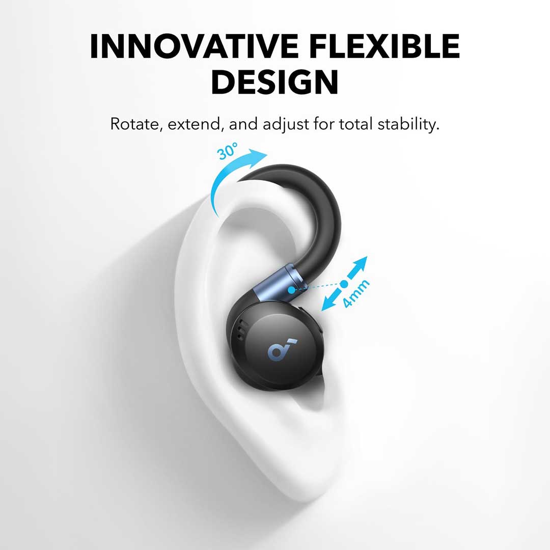 ایرباد Soundcore Sport X20 با تمرکز بر ثبات در گوش و کیفیت صدای بالا در حرکت طراحی شده است. قلابهای انعطافپذیر پشت گوش باعث میشود هنگام دویدن یا تمرینات شدید، ایرباد از گوش جدا نشود. درایورهای قدرتمند این مدل صدایی شفاف با بیس تقویتشده تولید میکنند که برای موسیقیهای انرژیبخش کاملاً مناسب است.