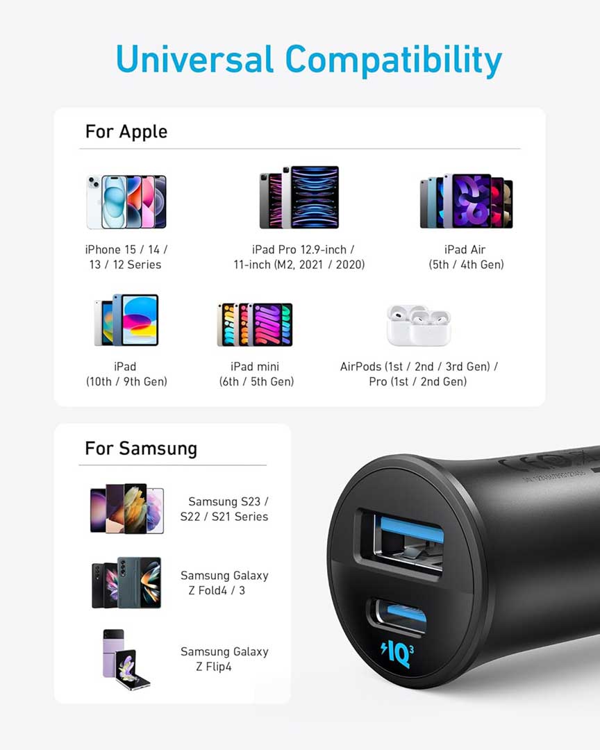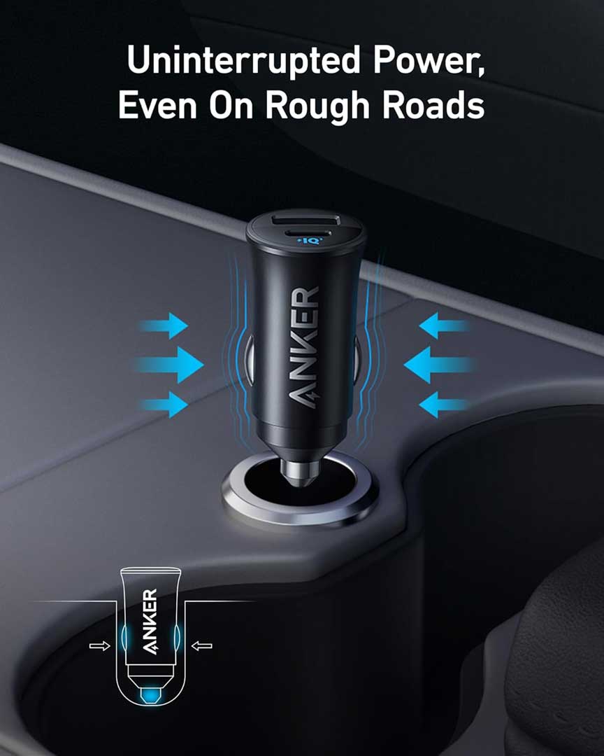 شارژر فندکی انکر Car charger 30W 2 ports A2741 یک شارژر سریع و باکیفیت خودرو است که برای تامین انرژی گوشی، تبلت و سایر دستگاه‌های دیجیتال در مسیرهای رانندگی طراحی شده است. این شارژر دارای دو پورت خروجی است که شامل USB-C با پشتیبانی از شارژ سریع PD و USB-A با تکنولوژی PowerIQ می‌باشد. توان خروجی کلی این شارژر تا ۳۰ وات بوده و شدت جریان بالای آن امکان شارژ سریع و ایمن انواع گوشی‌های هوشمند، تبلت و لوازم جانبی دیجیتال را فراهم می‌کند.